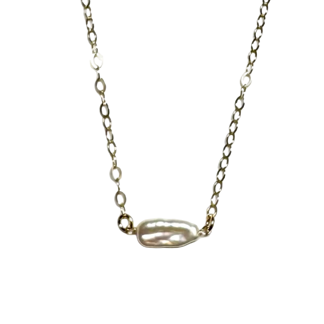 The Freshwater Gold Necklace sits on a gold filled chain that measures 15”. All chain components are gold filled and will not tarnish.