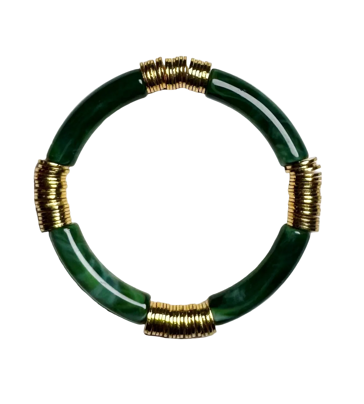 This bracelet is made with 8mm curved acrylic beads and brushed gold heishi beads.